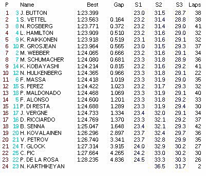 Vettel mg Lewis Hamilton sorakozott fel, b hrom tizedmsodperces htrnnyal, mikzben a brit csapattrsa, Jenson Button az edzs elejn folyamatosan alulkormnyzottsgra panaszkodott, ezrt a boxban tovbbi belltsokra volt szksge. A lgy gumikon azonban a 2009-es bajnok is belelendlt, s tbb mint egy tizeddel megelzte az len ll Vettelt, mikzben Hamilton el Nico Rosberg sorolt be.