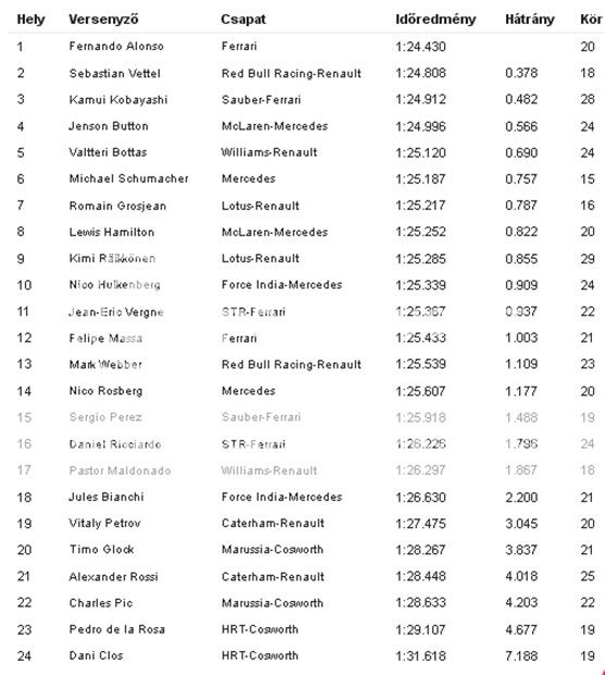 A leintsig mr nem trtnt vltozs, Alonso,Vettel, Kobajasi tri mgtt Button mr t tizeddel maradt el a Ferraritl, viszont az els 11 versenyz egy msodpercen bell volt a tabelln. Alonso csapattrsa, Felipe Massa ppen csak kiesett ebbl a krbl, vgl a 12. helyen zrt. Button utn mg Bottas, Schumacher, Grosjean, Hamilton, Rikknen s Hlkenberg frt be a top 10-be.